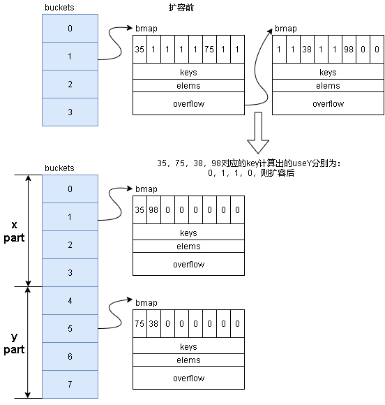 3.如果是双倍扩容,则会分为高和低两部分(两部分容量相等),并使用两个exacDst:y和x分别对应高位和低位。计算落到高位还是低位。